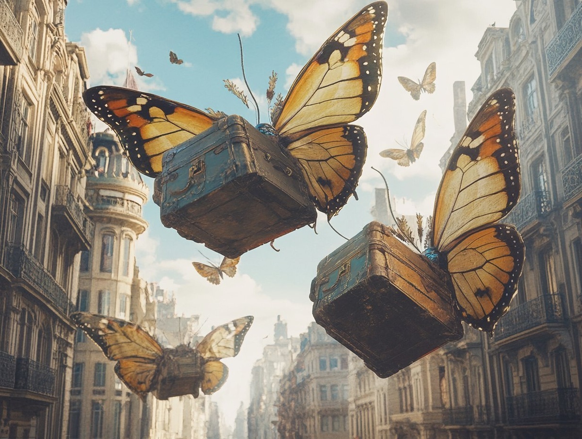 Создано на основе запроса: a photograph of a 5 giant butterflies with a humanoid faces carrying large travel trunks on the backs of their bodies. The butterflies are flying by the tops of buildings in 18th century New York. Sony A65 camera.