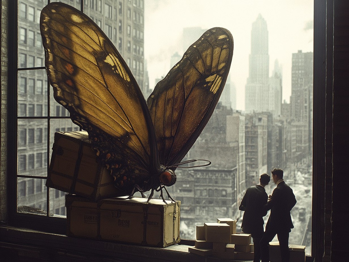 Создано на основе запроса: a photograph of a giant butterfly with a humanoid face carrying a large travel trunk on the back of its body. The butterfly is standing on the ledge of an open window overlooking 18th century Chicago. Two business men are off to the side packing boxes, bags, and travel trunks. Sony A65 camera. --- Автоперевод: Фотография гигантской бабочки с гуманоидным лицом, несущим большой ствол путешествий на задней части его тела. Интересно получилось? 🤔 https://dzen.ru/id/65c0c65c86e4f837c27b24d7 #ИИ #AI #нейросеть #midjourney #art