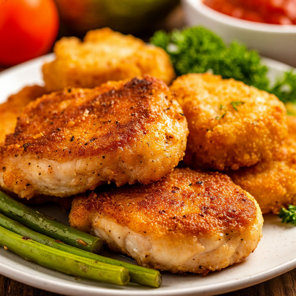 Вот простой и вкусный рецепт куриных отбивных: ▎Ингредиенты: • 500 г куриного филе (куриная грудка) • 1-2 яйца • 100 г панировочных сухарей • 100 г муки • Соль и перец по вкусу • Специи (по желанию, например, паприка, чеснок, итальянские травы) • Растительное масло для жарки ▎Приготовление: 1. Подготовка курицы: Куриную грудку промойте, обсушите и нарежьте на тонкие пласты (примерно 1-1.5 см). Можно также слегка отбить мясо кухонным молотком, чтобы оно стало более нежным. 2. Приготовление панировки: • В одной тарелке положите муку, посолите и поперчите. • В другой тарелке взбейте яйца с щепоткой соли. • В третьей тарелке положите панировочные сухари и добавьте специи по вкусу. 3. Панировка: Каждый кусочек куриного филе обваляйте сначала в муке, затем окуните в яйцо, а после обваляйте в панировочных сухарях. 4. Жарка: На сковороде разогрейте растительное масло на среднем огне. Обжаривайте отбивные с обеих сторон до золотистой корочки (примерно 3-5 минут с каждой стороны). Убедитесь, что