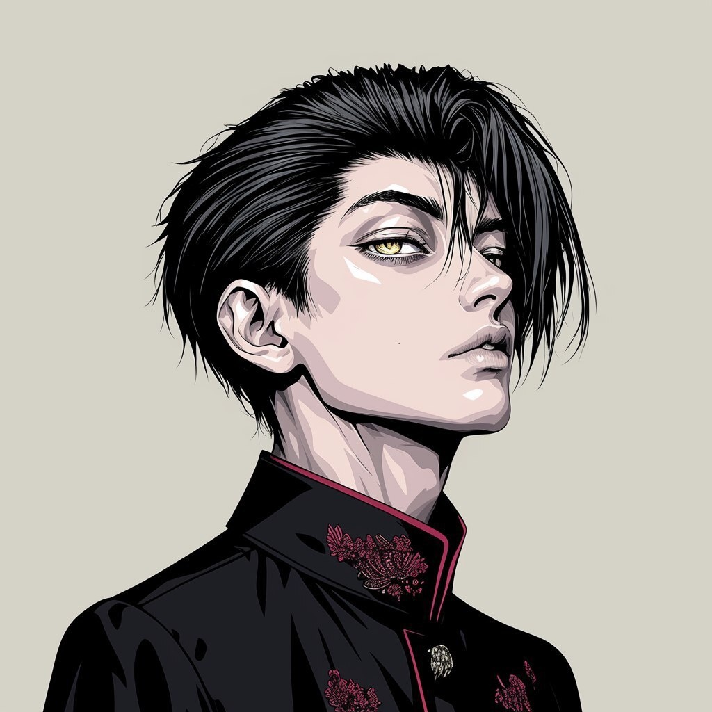 Создано на основе запроса: A realistic side profile portrait of a boy in an anime style, cel-shading, flat design, extreme contrast, simple shapes and lines, wearing a deep crimson business suit with gold embroidered details, short slicked-back jet black hair, slender golden eyes, natural warm beige skin tone, dramatic lighting, strong cel-shading on face, solid warm beige background, ultra-detailed ink lines, 8K --- Автоперевод: Реалистичный портрет с боковым профилем мальчика в аниме стиля, разбрызгивании хел, плоский дизайн, экстремальный контраст, простые формы и линии, одетый в глубокий багенный деловой костюм с золотой вышитой деталями, коротким гладко Как тебе генерация? 🤔 https://dzen.ru/id/65c0c65c86e4f837c27b24d7 #ИИ #AI #нейросеть #midjourney #art
