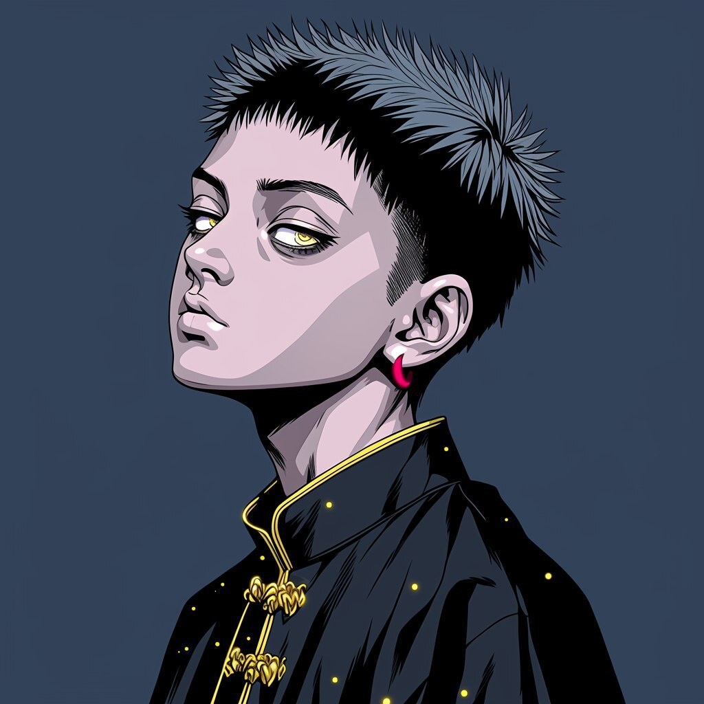 Создано на основе запроса: A realistic side profile portrait of a boy in an anime style, cel-shading, flat design, extreme contrast, simple shapes and lines, wearing a deep navy kimono with gold thread patterns, short spiky auburn hair, slender ghostly white eyes with no pupils, natural warm beige skin tone, subtle glowing particles floating around his head, dramatic lighting, strong cel-shading on face, solid deep navy background, ultra-detailed ink lines, 8K --- Автоперевод: Реалистичный портрет с боковым профилем мальчика в аниме стиля, сценаринг, плоский дизайн, экстремальный контраст, простые формы и линии, одетый в глубокий военно-морской кимоно с золотыми нитками, короткие колючи Как тебе иллюстрация? 🤔 https://dzen.ru/id/65c0c65c86e4f837c27b24d7 #ИИ #AI #нейросеть #midjourney #art