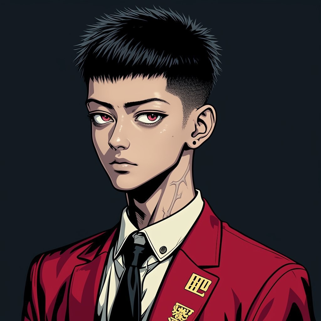 Создано на основе запроса: A realistic side profile portrait of a boy in an anime style, cel-shading, flat design, extreme contrast, simple shapes and lines, wearing a deep crimson tailored Yakuza suit with subtle golden dragon embroidery, short slicked-back dark brown hair, slender ember-red eyes, natural warm beige skin tone, glowing lava-like veins subtly visible along his neck and arms, dramatic lighting, strong cel-shading on face, solid deep navy background, ultra-detailed ink lines, 8K