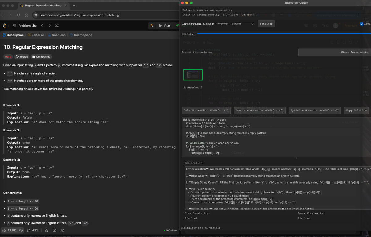 Твой помощник на собеседовании Недавно я наткнулся на интересный платный сервис, который помогает людям проходить алгоритмические собеседования. Идея мне понравилась, но захотелось сделать открытую и бесплатную версию, которой мог бы воспользоваться каждый. Так родился Где это пригодится? Надо ли даже писать? Но для новичков проговорю В 90% собеседований вам надо будет написать код в прямом эфире, пока за тобой наблюдают. Многие из нас сталкивались с ситуацией, когда из-за волнения не получается сосредоточиться, даже если подобные задачи ты решал раньше: - Когда нервничаешь на алгоритмических раундах LeetCode-задач - В ситуациях, когда нужно быстро предложить эффективное решение Interview Corvus поможет вам в реальном времени генерировать решения, анализировать сложность и оптимизировать код Что умеет Interview Corvus - Генерирует решения на основе скриншотов задачи — просто сделайте снимок экрана (встроено в программе с шорткатом) - Предоставляет анализ сложности - Работает с раз