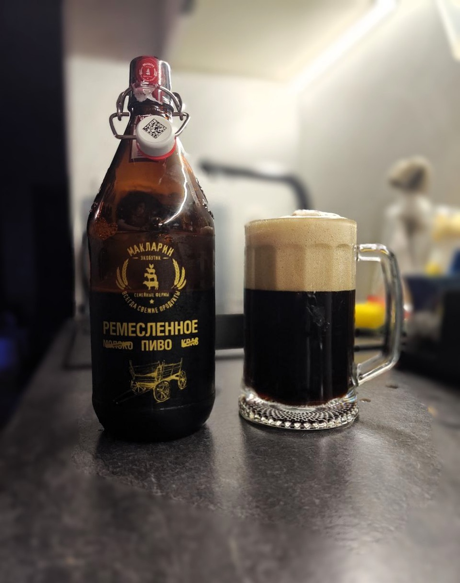 Всем привет. Сегодня на пробе Макларин Ремесленное Темное. В 40-й части Мыслей о пиве уже было Ремесленное, но только светлое. Тара, этикетка и весь дизайн абсолютно идентичен с светлым пивом, также есть этикетка с маркером охлаждения и наклейка с происхождением и номером партии хмеля. Классифицируется как темное пиво, нефильтрованное, пастеризованное, неосветленное. Алкоголь 4,5% плотность 11%. Срок годности пива – 120 дней и 12 часов после вскрытия. Состав классический вода, хмель жженый, солод и дрожжи. Пена очень плотная, держится долго, даже на стенках бокала остается. Запах больше светлого пива, немного отдает корочками. Цвет очень темный практически черный. Вкус тоже отличается от светлого чувствуется жженый хмель, но хлебного вкуса нет, что скорее минус для темного пива. Горечи нет ни во вкусе не в послевкусии. Пьется легко, но не хватает плотности и вкуса хлеба. Что было плюсом для светлого для темного больше минус. Цена около 250 р. В качестве вывода, светлое берите без разду