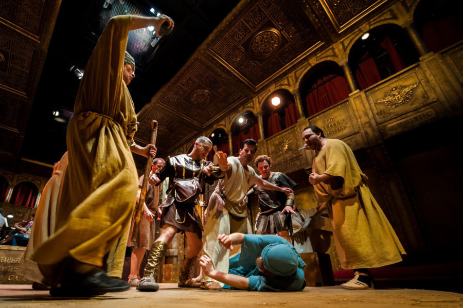 «Сервилия» создавалась для большой императорской сцены (мировая премьера в 1902 году состоялась в Мариинке), и, конечно, покровцам пришлось нелегко. Вписать сего мастодонта в формат камерной площадки на Никольской — равноценно подвигу. Благодаря художнику Виктору Герасименко зал театра преобразился до неузнаваемости. Зритель оказывается внутри не то римского форума, не то базилики, в окружении золоченых арок и лестниц, астральных символов и надписей на латыни. Режиссер Ольга Иванова центральное место отводит маэстро Рождественскому: оркестр располагается прямо на сцене, а все действо разворачивается вокруг него в непосредственной близости к публике. На небольшом пространстве Ивановой удается искусно развернуть и танец вакханок, и суд трибунала, и шумный римский рынок, и инфернальную оргию чародейки Локусты.
