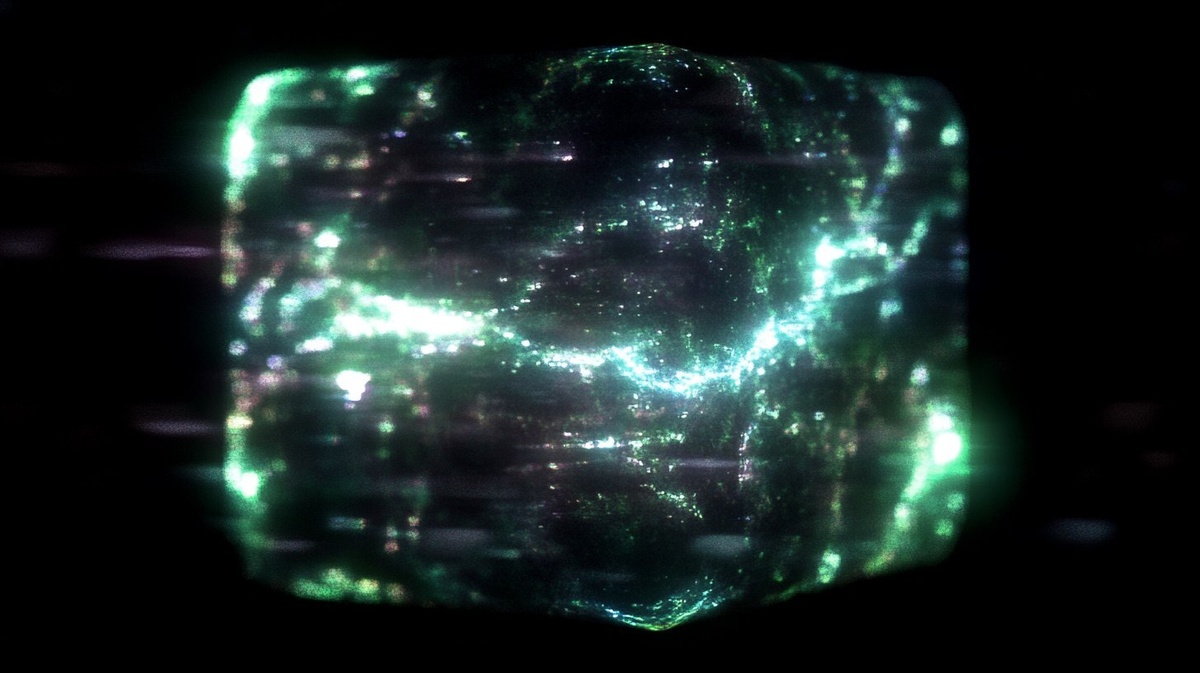Автоперевод: Гиперкуб, сделанный из потрескивания обсидиана с синей молнией, отображается в Мандельбулбе