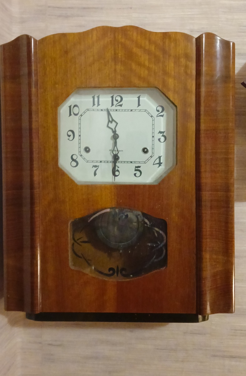 Доброго времени суток! В ремонт поступили часы Янтарь с четвертным боем. Часы в нормальном состоянии для своих лет. приступаю. Часы стоят и ходить не хотят совсем. И с боем также проблема, молоточки целых часов бьют постоянно не прекращая. Открутил два винта и демонтировал механизм. Циферблат и стрелки в хорошем сохране. Механизм также в хорошем состоянии. Откручиваю деревянную планку от механизма, она кажется из бука. Часы конечно бывали в ремонте. Нестандартные штифты крепления механизма к циферблату стоят. Гайка крепления стрелок накручена вкось. Снял штифты крепления циферблата. Самая левая собачка почти оторвалась, был бы сюрприз владельцу если бы она соскочила в момент завода пружины, пальцы точно были бы с синяками. Целая ударная батарея - 8 молоточков. В момент спуска пружины собачка отвалилась и я слегка по пальцам получил, но это мелочи, главное что кости целы ))) Извлекаю барабаны, они здесь все разных диаметров, 2 на бой и один на ход. Снял скобу - небольшая выработка прису