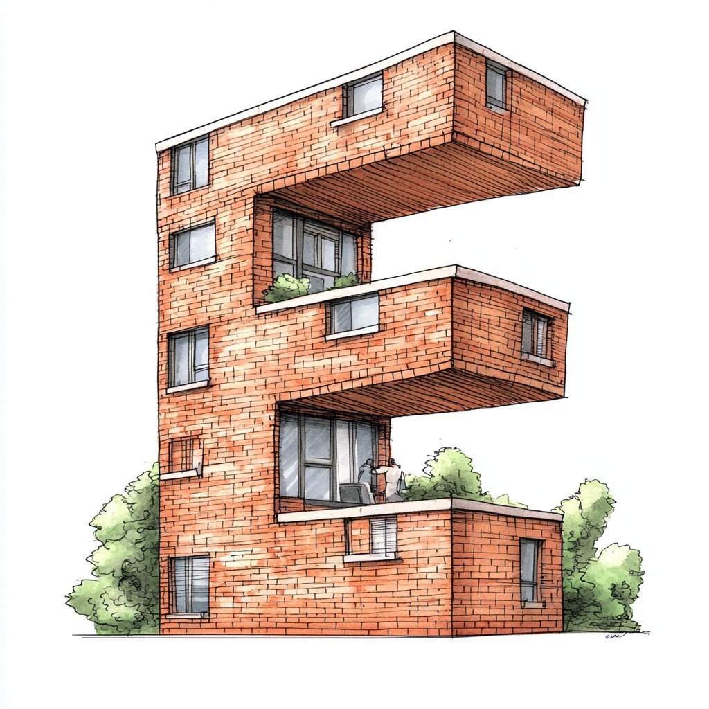 Создано на основе запроса: In the style of a hand-drawn architect's design with a white background, draw a newly built, modern, brick apartment building shaped like the capital letter E. It is important that the viewer immediately recognizes the capital letter E. The building has poor sound insulation. In the windows, you can see residents covering their ears.