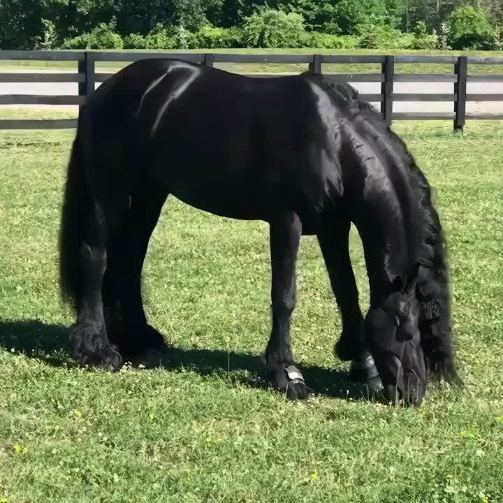 Очень красивый черный конь с модной гривой бегает по вольеру