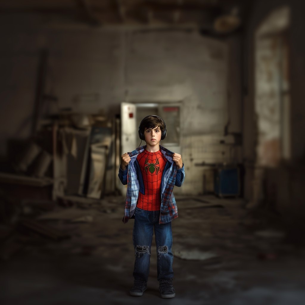 Создано на основе запроса: A 9-year-old boy dressed in normal clothes, holding his shirt open to reveal a bit of the Spider-Man suit underneath. Wearing headphones. SPIDER MAN