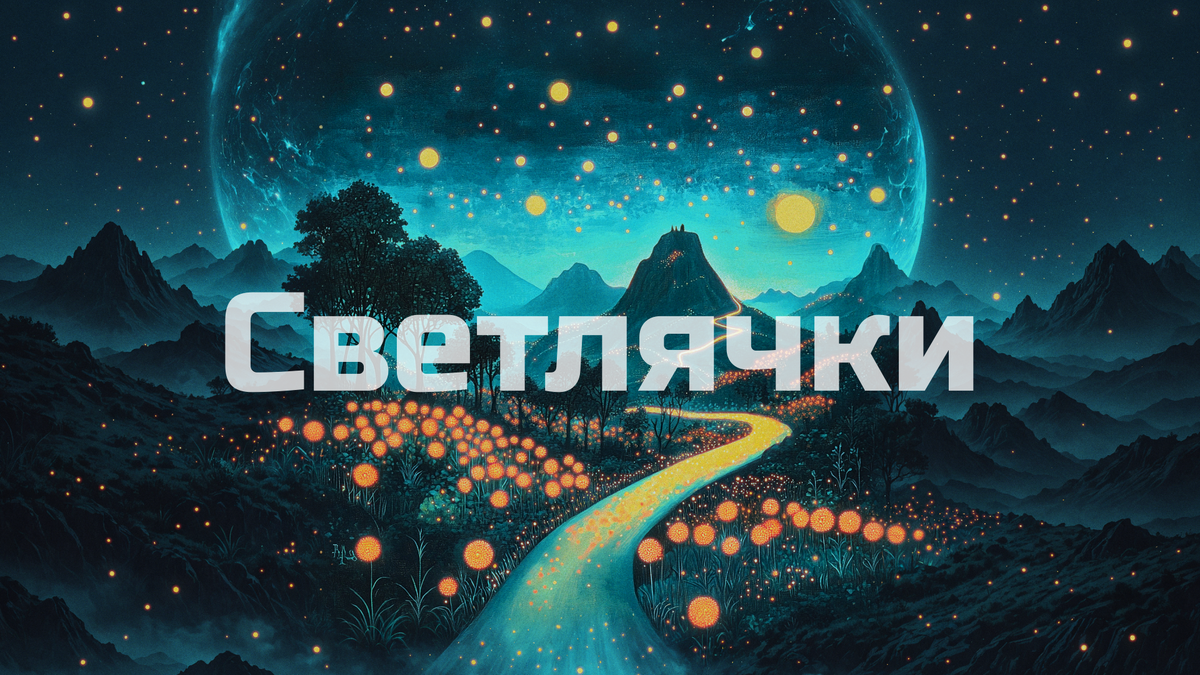 Вдоль дороги на листочках Россыпь чудных огоньков. Ярко светит темной ночью Звездный путь из светлячков. Мимо них как космонавты На прозрачном корабле По светящемуся тракту Продвигаемся к луне. Вмиг зеленый свет наполнил В сумраке угрюмый лес. Изумрудных листьев волны Приоткроют дверь чудес. Все деревья вдруг живые. Слышно, как они поют Песни многовековые Про вселенную свою. Про красивые долины, Шумных рек далекий край. Про старинных исполинов. Про всё то, что мы не знаем. Горы высоты безмерной. Глубочайшие моря, Где на дне ещё лишь дремлет Ставшая теперь земля. Девять солнц на горизонте, А за ними восемь лун. Кольца в поднебесье бродят Будто их отдал Сатурн. А рисунки светом в небе? Посмотри какой узор. Брызги, всполохи и петли. Полотно из о́бразов. Свет и на полях бескрайних Всех оттенков, всех цветов. Колосящееся пламя Разноцветных светлячков. К ним дотронуться руками Можно, и проникнуть в цвет. То карминно-красным станешь, Или вереск-фиолет. От земли здесь оторваться Мож