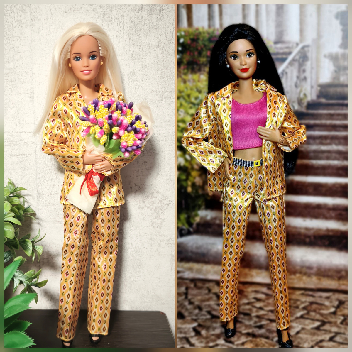 Мне очень понравилась идея челленджа от автора канала @Дневники кукол Тамики "одеть кукол одинаково", и особенно - идея объединиться с другим каналом!) Пример такого объединения увидела у @xjaneshepardx , и после прочтения ее статьи сразу написала Тане @mydollsmyworld с предложением коллаборации😁 У наших с Таней кукол немало одинаковых нарядов, но мы не стали мудрить, выбрали восемь, которые первыми пришли в голову. Договорились одеть кукол согласно списку, а потом одновременно обменяться фотографиями, было интересно, кто какую куклу выберет для демонстрации нарядов. Итак, что у нас получилось! Желтый костюм от Чонгука у нас носят девочки. Любопытно, что мы обе дополнили его ярко-розовыми аксессуарами - Скиппер держит букет, у Даны топик. Черное платье с алика у нас надели девушки с пышными шевелюрами: моя Мелисса и Танина Катя (моя тезка, кстати😊). Сарафан от Эленприв примерили голубоглазые блондинки - правда, из разных эпох)) Джаззи из 80х и современная "луковка" по имени Ан