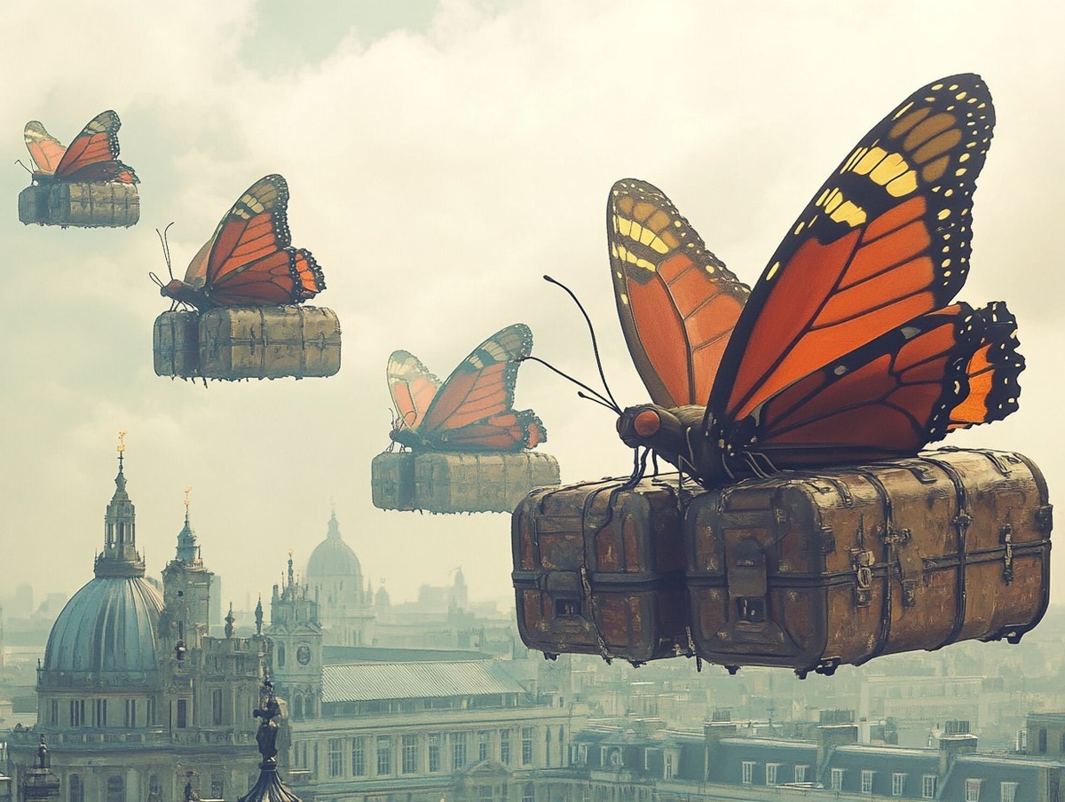 Создано на основе запроса: a photograph of a 5 giant butterflies with a humanoid faces carrying large travel trunks on the backs of their bodies. The butterflies are flying by the tops of buildings in 18th century London. Sony A65 camera. --- Автоперевод: Фотография 5 гигантских бабочек с гуманоидными лицами, несущими большие туристические стволы на спине их тела. Необычно выглядит? 🤔 https://dzen.ru/id/65c0c65c86e4f837c27b24d7 #ИИ #AI #нейросеть #midjourney #art