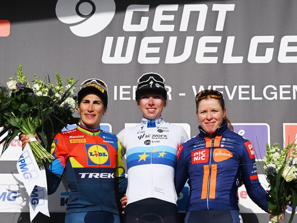 Лорена Вибес одержала впечатляющую победу на женской версии велогонки «Гент — Вевельгем», завоевав свою сотую профессиональную победу. Сделала она это в спринте. Второй финишировала Элиза Бальзамо, а тройку призёров замкнула Шарлотта Кул. Гонка началась с раннего отрыва группы из семи гонщиц, однако пелотон быстро их настиг, чему поспособствовал сильный ветер. На протяжении дистанции произошло несколько падений, в том числе с участием фаворитки Элизы Лонго Боргини. На последнем подъёме Кеммельберг чемпионка мира Лотте Копеки совершила мощный рывок, за которым смогли уследить только несколько гонщиц, включая Вибес. После спуска к группе присоединились Хлоя Дайгерт, Джиада и Летиция Боргези. Несмотря на попытки отдельных гонщиц уйти в отрыв на последних километрах (Аннеке Дейкстра, Флортье Макай), контроль над гонкой сохраняли команды Lidl — Trek и особенно SD Worx — Protime. В финальном спринте Копеки обеспечила идеальную передачу для своей команды: Вибес открыла спринт за 250 метров до