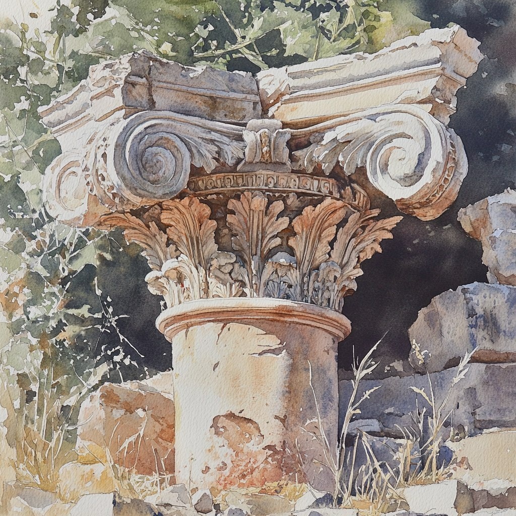 Создано на основе запроса: a loose watercolor of an ancient Corinthian capital lying in the foreground