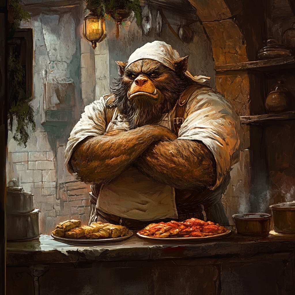 Создано на основе запроса: colourful d&d artwork of a bugbear chef with a hair net, arms crossed in a tough way, standing behind a food