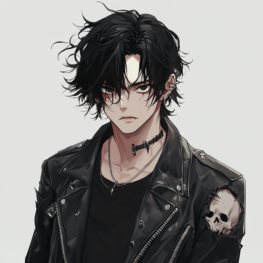 Создано на основе запроса: A anime Japanese Male with black hair white streaks, wearing a leather skull jacket with the sleeves torn off