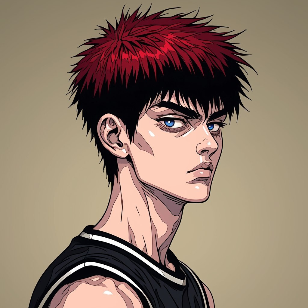 Создано на основе запроса: Side profile portrait of a teenage boy in an anime style, Junji Ito horror manga influence, cel-shading, flat design, high contrast, simple shapes and lines, wearing a dark green basketball jersey with white stripes, messy dark red hair with black tips, intense blue eyes, solid beige background, ultra-detailed ink lines, 8K