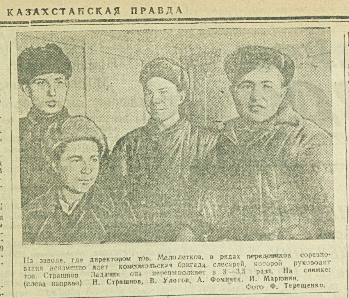 В этот день, 31 марта 1945 года, газета «Казахстанская правда» публикует фотографию передовиков – слесарей, перевыполнивших задание в 3,5 раз На заводе, где директором тов. Малолетков, в рядах передовиков соревнования неизменно идет комсомольская бригада слесарей, которой руководит тов. Страшнов. Задания она перевыполняет в 3 -3,5 раза. На снимке: (слева направо) Н. Страшнов, В. Улогов, А. Фомичек, И. Марюнин. Фото Ф. Терещенко. («Казахстанская правда», 31 марта 1945 г., суббота). ххх НАЧАЛАСЬ ПОСАДКА СВЁКЛЫ В этот день, 31 марта 1945 года, газета «Казахстанская правда» заметку о новом способе выращивания сахарной свёклы. Добившись первоклассных результатов, казахстанские семена свёклы распространили по разным республикам. Джамбул. 30 марта (КазТАГ). В семеноводческих свеклосовхозах Джамбульской области началась посадка маточной сахарной свёклы. Посадка впервые проводится одновременно с нарезкой поливных борозд на всей площади плантаций. Это обеспечит ранний полив, необходимый для друж