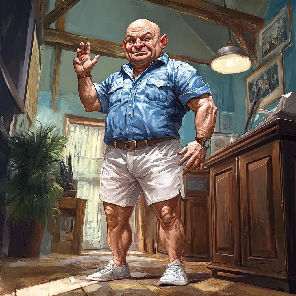 Создано на основе запроса: d&d art art of a comically very very short, very ver wide middle-aged man completely bald , wearing a buttoned-up blue shirt and white shorts, with a smug annoying look on his face, casually waving next to a desk in an office