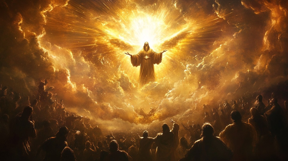 Создано на основе запроса: A dramatic and divine scene showing God speaking from the heavens to humanity below
