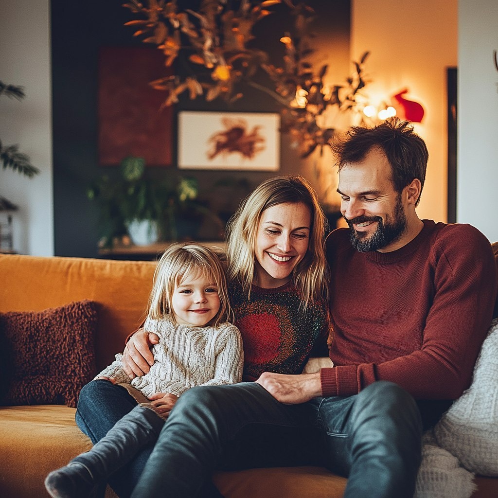 Создано на основе запроса: photo of a family in their living room, modern warm interior, woman 34 years old, man 36 years old, child girl 4 years old