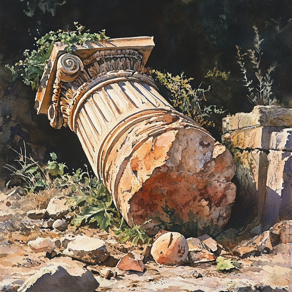 Создано на основе запроса: a loose watercolor of an ancient Corinthian capital lying tipped over, in the ground, in the foreground. the corinthian capital is decorated with acanthus leaves and the egg and dart motif. loose watercolor of ancient Corinthian ruins.