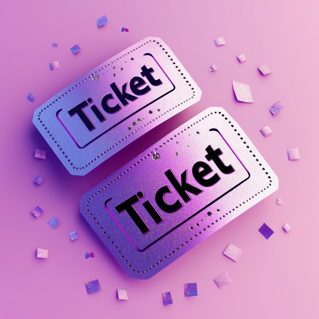 Создано на основе запроса: 3D concert tickets, backstage passes, and VIP passes, paper art style, sticker, grid, glitter purple silver and blue, in the style of hyperrealistic illustration, use word: "Ticket"