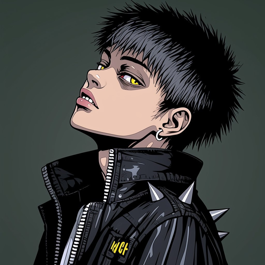 Создано на основе запроса: Side profile portrait of a teenage boy in an anime style, Junji Ito horror manga influence, cel-shading, flat design, high contrast, simple shapes and lines, wearing a black leather jacket with silver spikes, short spiky black hair with silver highlights, sharp yellow eyes with a sinister glow, solid dark green background, fanged teeth and a dark shadow, ultra-detailed ink lines, 8K --- Автоперевод: Портрет с боковым профилем подростка в аниме стиля, влияние манги ужасов Junji Ito, сценариваемости, плоского дизайна, высокого контраста, простых форм и линий, в черной кожаной куртке с серебряными шипами, короткими шипенными черными волосами с серебряными бликами, острыми желтыми глазами со зловещим светом, сплошным темно-зеленым фоном, клей Неплохо выглядит? 🤔 https://dzen.ru/id/65c0c65c86e4f837c27b24d7 #ИИ #AI #нейросеть #midjourney #art