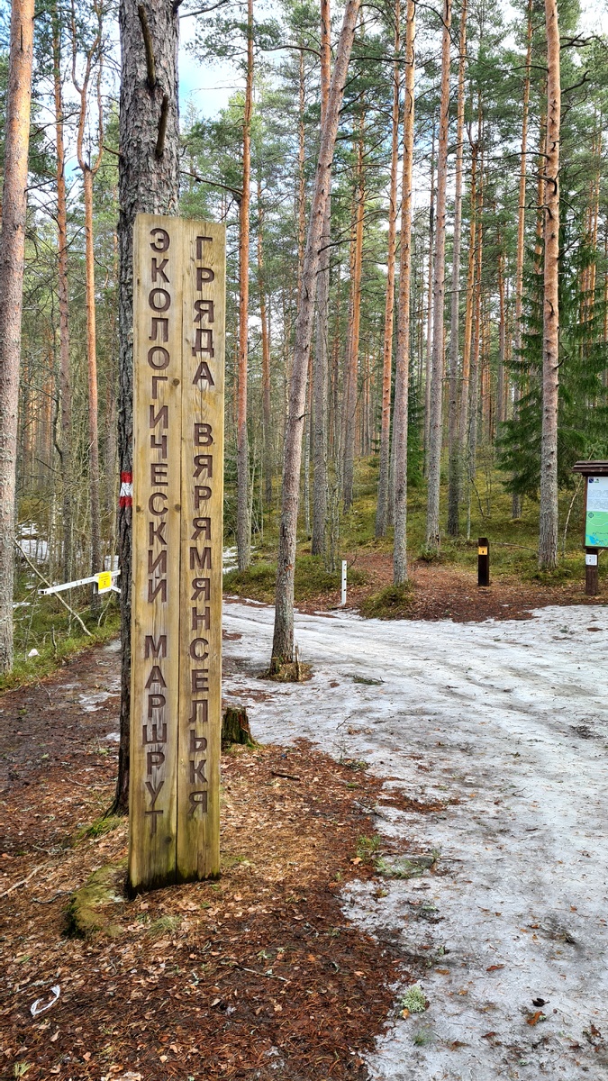 Мы с мужем решили провести последние выходные марта 2025 года на природе, за городом, так как все сайты прогноза погоды настойчиво сообщали, что в субботу и воскресенье воздух прогреется до +15 градусов Цельсия. Для нашего города это аномальное тепло: у нас на майских праздниках часто намного холоднее и снег идёт. Решили освободить от работы пятницу и все три дня посвятить активному отдыху на природе. Котов оставили на дочку (или наоборот). Долго искала и выбирала варианты прогулок за городом, остановившись в итоге на природном заказнике на севере Ленинградской области "Гряда Вярямянселькя". В нём существует множество маршрутов, некоторые из которых были объединены в три экологические тропы. Я выбрала для нас экомаршруты "Озеро Светлое" и "Петяярви", а также наметила прогулку в виде обхода по кругу Нижнего Посадского озера. Мы решили проходить по одному маршруту в день, а для ночёвок между лесными походами я забронировала номер на базе отдыха "Лосево Парк" (Гостиничная ул., д.1, посёл