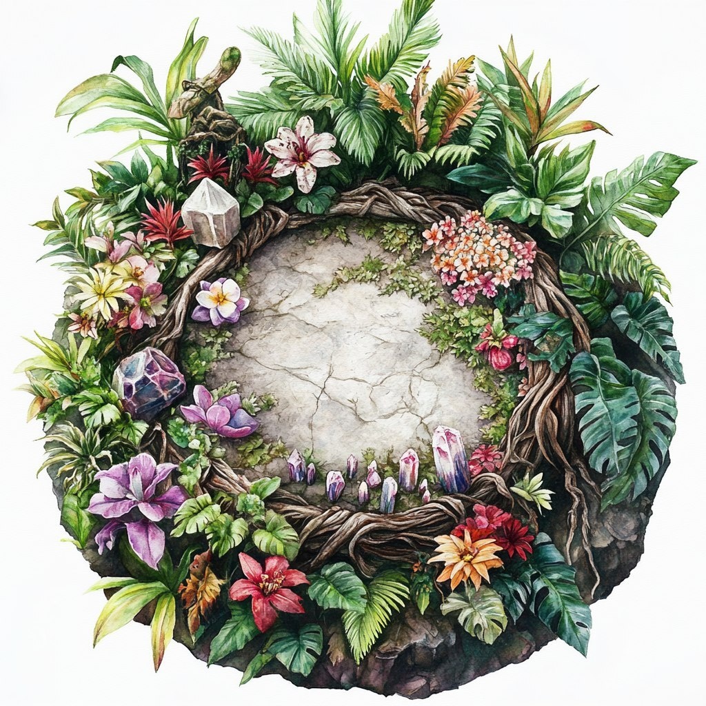 Создано на основе запроса: a watercolor illustration of a large circular jungle altar, made of a round altar stone decorated by flowers, roots, and crystals, surrounded by a ring of jungle plants. White background. Top-down view, birds eye.