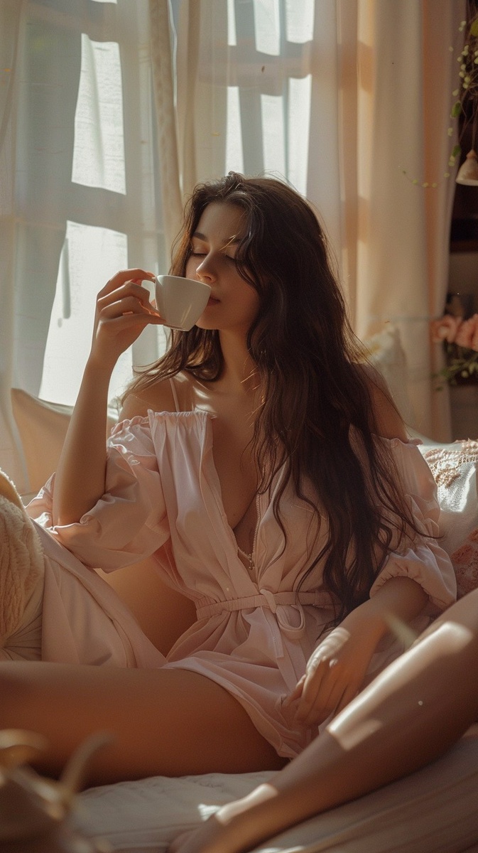 Создано на основе запроса: dreamy woman in pastel pink loungewear, sipping coffee on a cozy sofa, soft morning light, aesthetic background