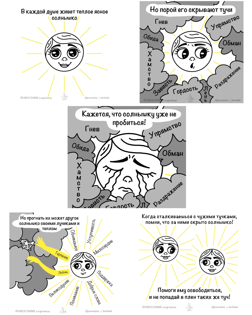 Сегодня знакомлю вас с творчеством православной христианки и иллюстратора. Марина через мини-комиксы, делится своим взглядом на этот чудесный мир. Простым языком и очаровательными рисунками ей удается передать то, что бывает тяжело выразить словами. В чем секрет? Наверное в искренности и добром юморе. Такие картинки можно рассматривать всей семьей! Изображения защищены авторким правом. Для использования в коммерческих целях свяжитесь с автором изображений При копировании материала ссылка на художника обязательна https://vk.com/pravoslavie_v_kartinkah