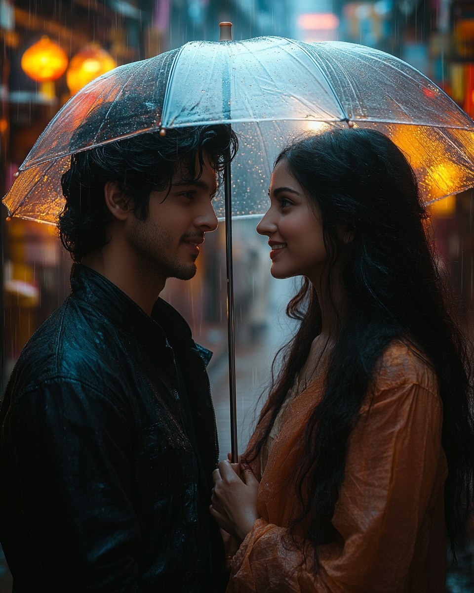 Создано на основе запроса: Two indan lovers stand under a shared transparent umbrella on a mumbi street, rain drizzling softly around them