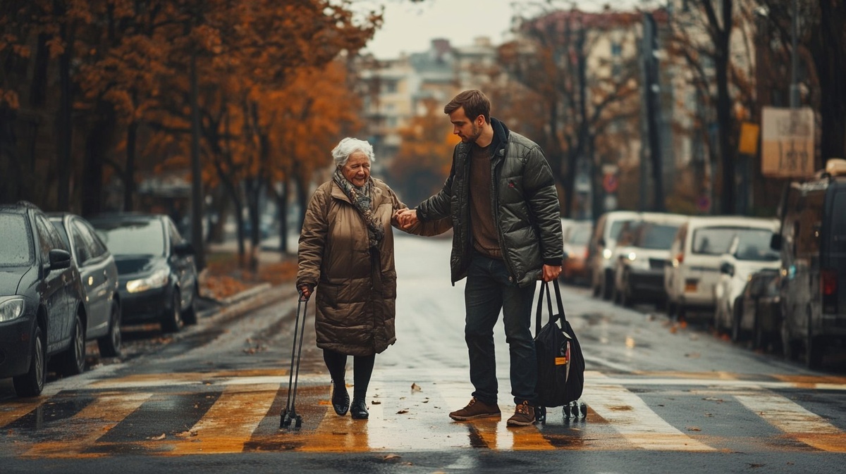 Создано на основе запроса: photorealistic young man helping an old woman across the street