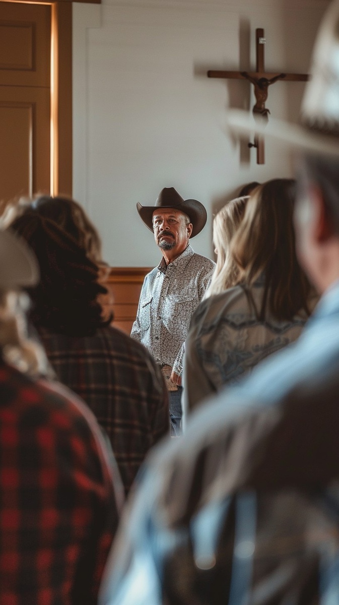 Создано на основе запроса: A country church gathering. Folks looking at the camera. A cowboy stands among them, smiling, his face full of peace. --- Автоперевод: Собрание сельской церкви. Как тебе картинка? 🤔 https://dzen.ru/id/65c0c65c86e4f837c27b24d7 #ИИ #AI #нейросеть #midjourney #art
