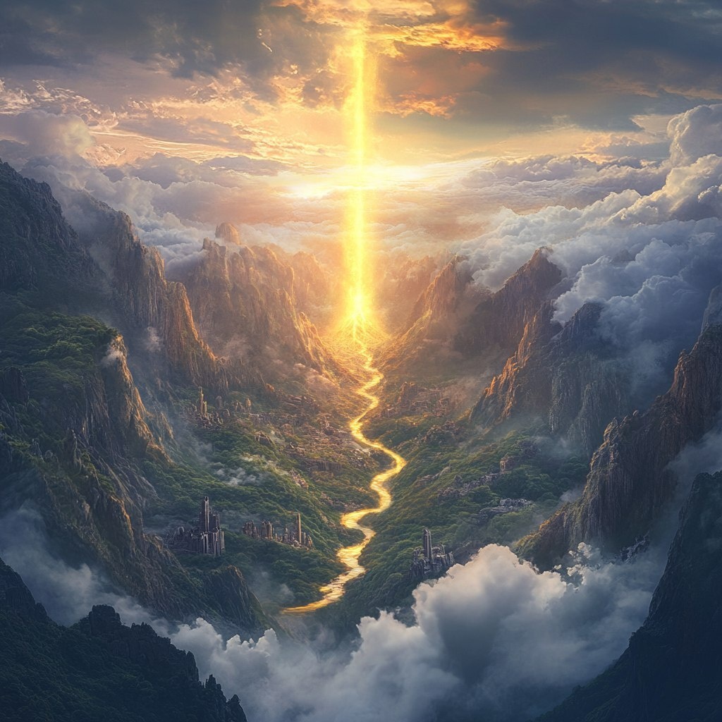 Создано на основе запроса: Fantasy valley seen from a high cliffside angle, looking down on a glowing golden beam of light bursting from the valley center, winding rivers reflecting the light, jagged mountains surrounding the scene, mist weaving through the landscape, mystical ruins partially visible from above, dramatic clouds overhead, cinematic atmosphere, epic fantasy landscape, ultra-detailed, 4K