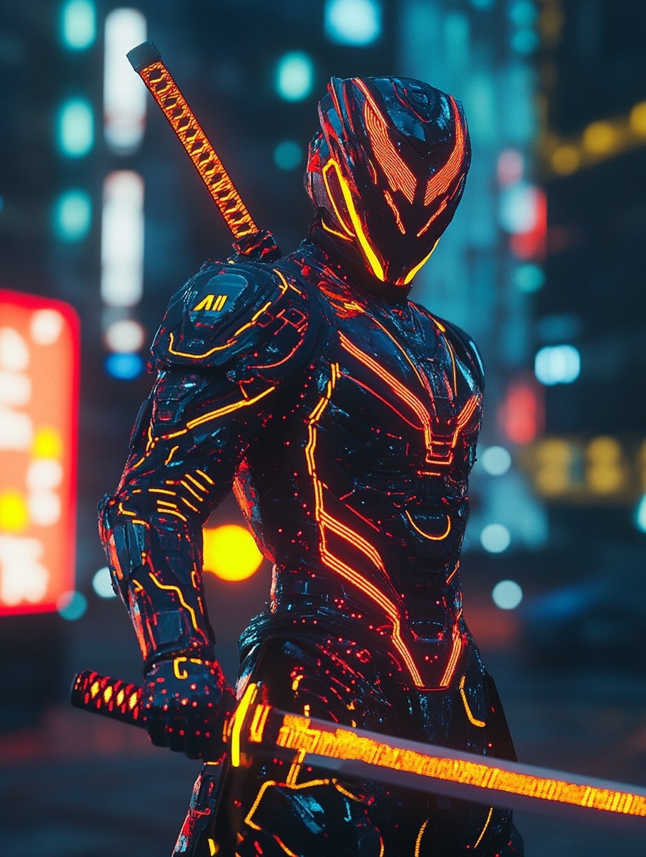 Создано на основе запроса: A futuristic cyber-samurai, his neon-bladed katana slicing through the air, a digital skyline behind him, glowing circuits on his armor , surreal.