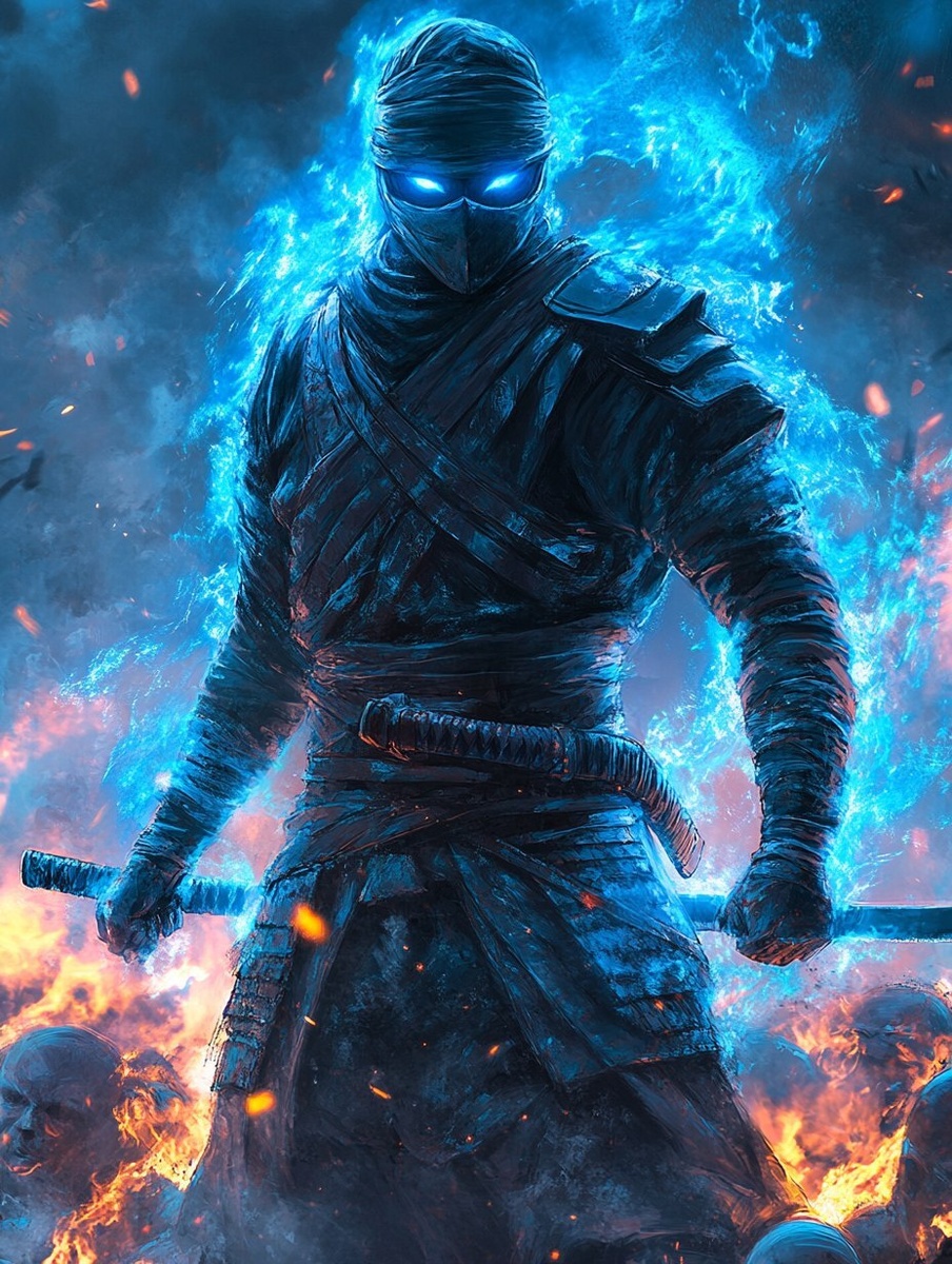 Создано на основе запроса: A masked warrior engulfed in blue flames, his eyes glowing with ancient power, standing on a battlefield filled with fallen enemies.