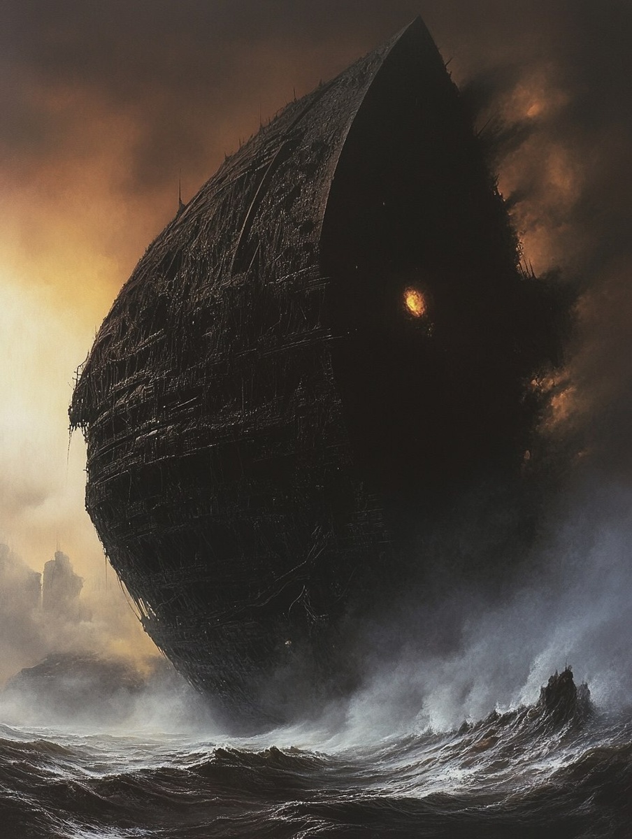 Создано на основе запроса: A massive black ship, its surface covered in dark metal scales and glistening with an eerie glow, emerges from the misty sea under a stormy sky. The setting sun casts long shadows on its intricate architecture as waves crash around it. In the style of Zdzisław Beksiński. --- Автоперевод: Массивное черное корабль, его поверхность, покрытая темными металлическими чешуйками и блестящая с жутким сиянием, выходит из туманного моря под бурным небом. Круто вышло? 🤔 https://dzen.ru/id/65c0c65c86e4f837c27b24d7 #ИИ #AI #нейросеть #midjourney #art