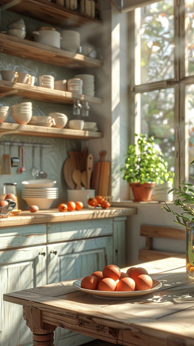 Создано на основе запроса: image of a greek clean cosy kitchen, a table in front and a plate with red eggs at Easter, morning lighting, extraordinary details, 8k UHD, hyper realistic, Cannon eos r6.