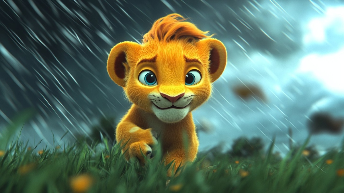 Создано на основе запроса: 3d cartoon animation Create a lion cub in a storm with the wind blowing
