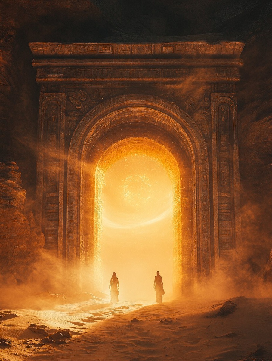 Создано на основе запроса: Two people standing in front of an ancient door. Inside the gate is sand and mist with light shining through, in the style of Craig Mullins.
