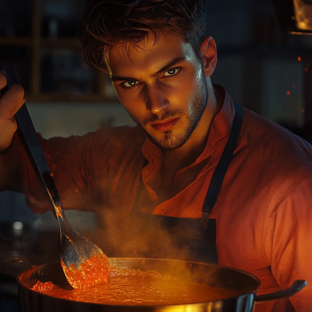 Создано на основе запроса: a young handsome man woth a light beard, with the super power of being a saucier-in-chief, able to make a special great magic sauce, looking deeply in your eyes while making his special sauce, realistic