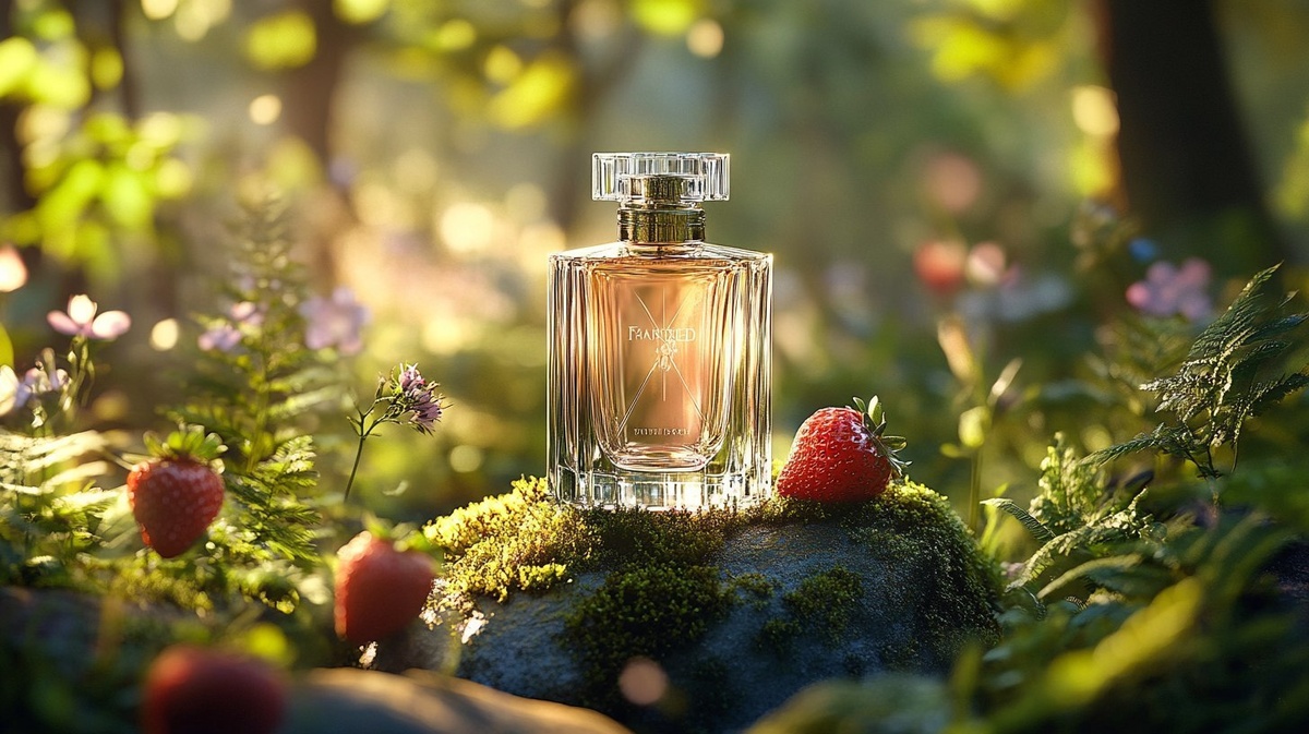 Создано на основе запроса: A serene garden at dawn, dew sparkling on lush greenery and fresh strawberries. In the center, a beautifully crafted bottle of Fragaria Creed perfume sits elegantly on a moss-covered stone, catching the soft morning light, surrounded by an array of wildflowers and ferns