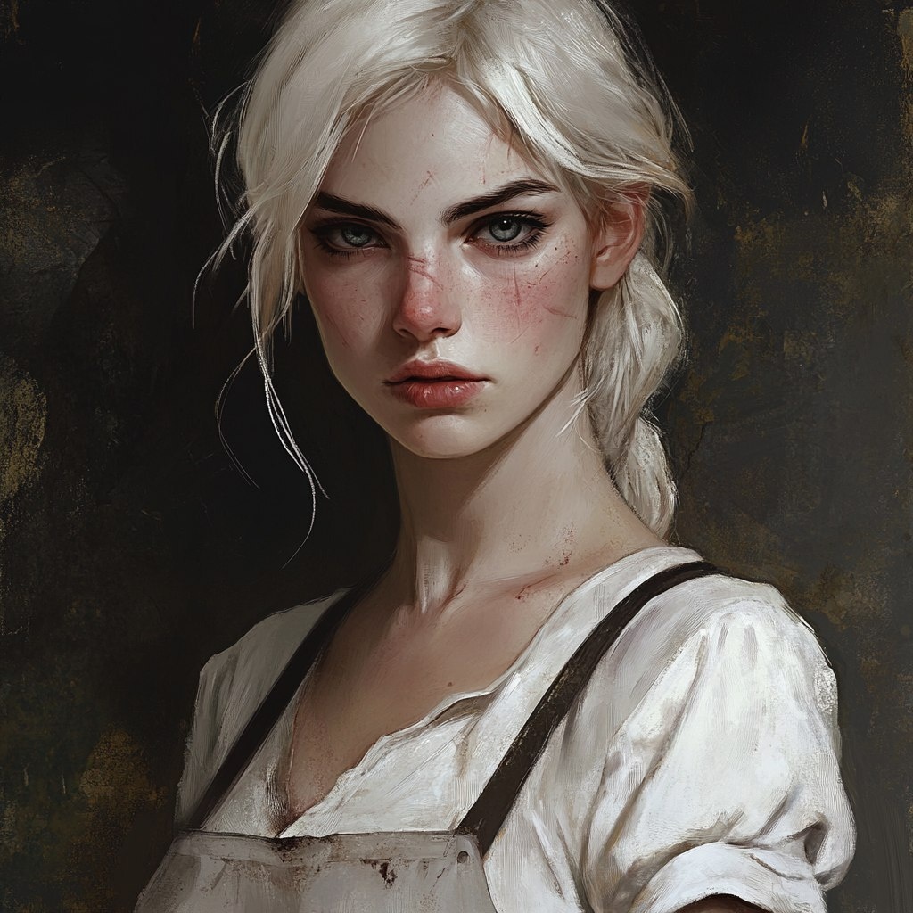 Создано на основе запроса: A portrait of a grim dark fantasy, Women doctor, pale skin, sharp features, platinum blonde hair, wearing a dirty white apron --- Автоперевод: Портрет мрачной темной фантазии, женский доктор, бледная кожа, острые черты, платиновые светлые волосы, в грязном белом фартуке Интересно получилось? 🤔 https://dzen.ru/id/65c0c65c86e4f837c27b24d7 #ИИ #AI #нейросеть #midjourney #art