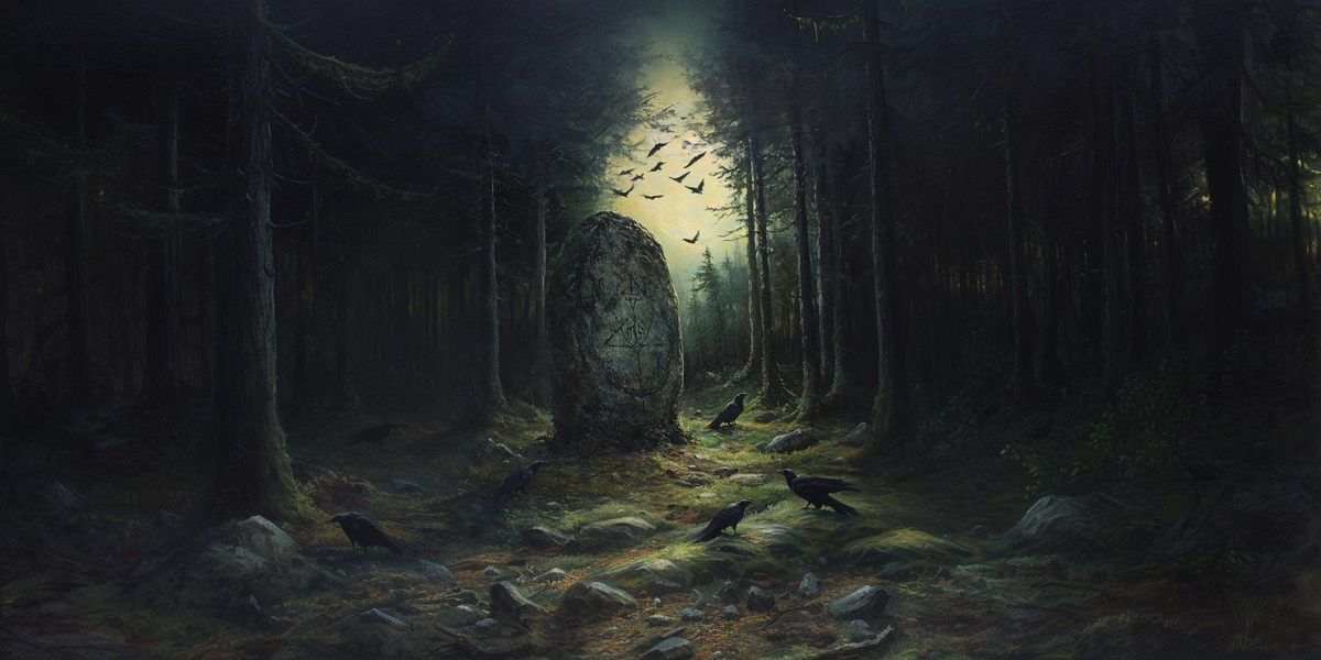 Создано на основе запроса: The raven stone, a glade in a dark forest where the darkness doesn't touch