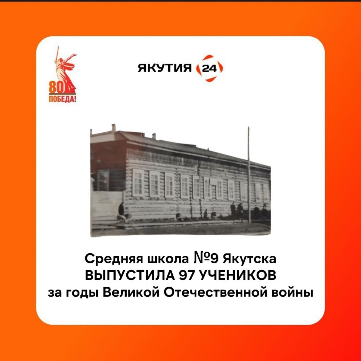В ответ на пост ⭐️ Путь к Победе: 80 фактов о Великой Отечественной войне Факт №42: Средняя школа №9 выпустила 97 учеников за годы Великой Отечественной войны. В тяжелые военные годы средняя школа №9 выпустила 97 учеников. Если в 1941 году аттестаты получили 29 человек, то к 1945-му их число сократилось до 10. Многие выпускники ушли на фронт, в том числе добровольно. Также в школе посильно оказывали и материальную помощь фронту. Так в фонд обороны из школы сдали 4 802 рубля деньгами и 2 202 рубля облигациями, 6 603 рубля от учителей и 1035,55 рубля от учеников — на танковую колонну «Социалистическая Якутия». От коллектива школы на передовую отправили за годы войны 204 подарка бойцам и 189 — партизанам, 233 теплые вещи. Кроме того, в учебном заведении организовали и тимуровскую помощь: поддерживали семьи фронтовиков и детей, чьи родители были на полях сражений. До Дня Великой Победы осталось 39 дней! #80фактов_о_Победе_Як24 @Якутия 24