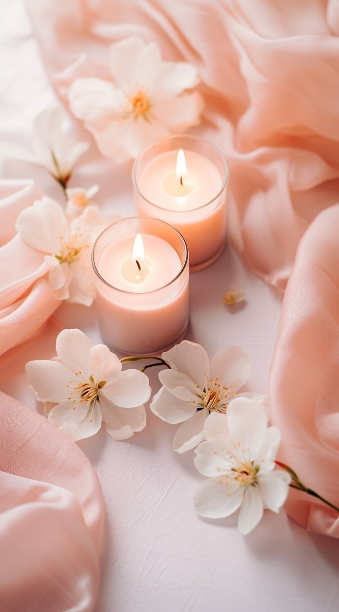 Создано на основе запроса: Elegant flat lay of candles and cards, surrounded by delicate peach silk fabric and white blossoms, creating an atmosphere perfect for Valentine's Day gifts or wedding-related events. The soft pastel color palette and gentle lighting highlight the textures and details. The photography was shot using a Canon EOS R5 camera with a macro lens, capturing the intricate patterns on the petals and ribbon texture.