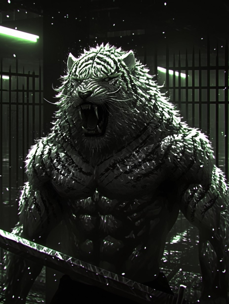 Создано на основе запроса: Muscular White weretiger berzerker warrior, with a sword, in a dungeon portcullis, roaring, mouth foaming with
